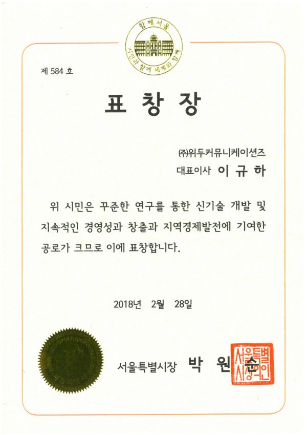서울특별시장 표창장 페이지 정보 작성자 WeDu 댓글 0건 조회 6,482회 작성일 19-05-30 19:35 본문 2018-02-28 표창장 제 584호 신기술 개발 및 지속적인 경영성 창출, 지역 경제 발전 기여 서울특별시장 박원순 List Previous2018 소년한국 우수 어린이 도서 19.05.30 Next서울클러스터 어워드 우수상 19.05.30