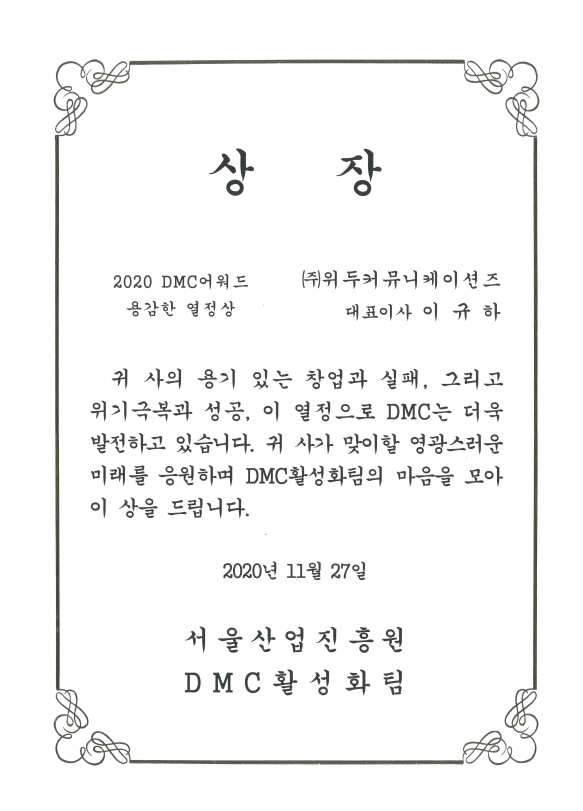 2020 서울산업진흥원 2020 DMC어워드 페이지 정보 작성자 WeDu 댓글 0건 조회 5,431회 작성일 21-12-31 12:57 본문 2020-11-27 2020 DMC어워드 용감한 열정상 서울산업진흥원 DMC활성화팀 List Previous2020 기술혁신 우수기업 21.12.31 Next2018 소년한국 우수 어린이 도서 19.05.30