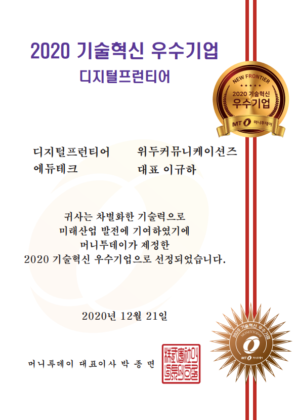 2020 기술혁신 우수기업 페이지 정보 작성자 WeDu 댓글 0건 조회 5,856회 작성일 21-12-31 12:58 본문 2020-12-21 2020 기술혁신 우수기업 디지털프런티어 에듀테크 머니투데이 대표이사 List Previous2020 소년한국 우수 어린이 도서 선정 21.12.31 Next2020 서울산업진흥원 2020 DMC어워드 21.12.31