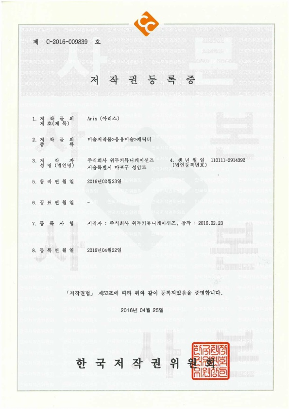 [한국/저작권] 아리스 페이지 정보 작성자 WeDu 댓글 0건 조회 6,036회 작성일 19-05-30 19:09 본문 2016-04-22 저작권 C-2016-009839 아리스 / 미술저작물>응용미술>캐릭터 List Previous[한국/저작권] 필립 19.05.30 Next[한국/저작권] 리안 19.05.30
