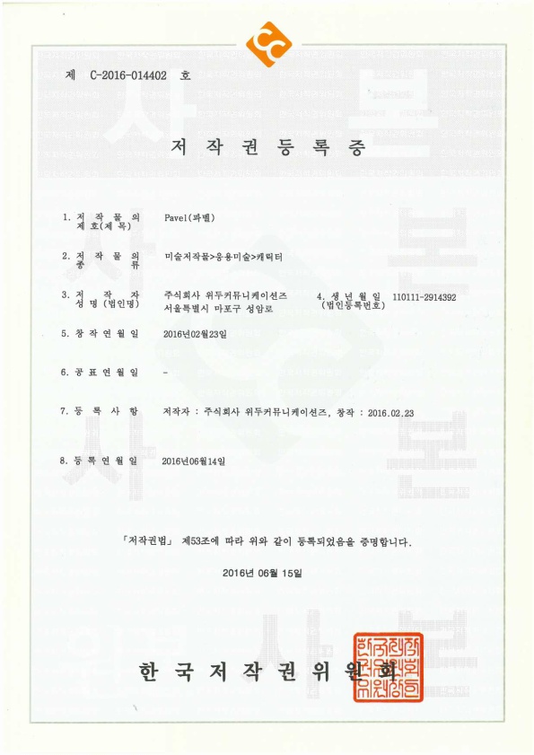 [한국/저작권] 파벨 페이지 정보 작성자 WeDu 댓글 0건 조회 5,864회 작성일 19-05-30 19:11 본문 2016-06-15 저작권 C-2016-014402 파벨 / 미술저작물>응용미술>캐릭터 List Previous[한국/저작권] 누미 19.05.30 Next[한국/저작권] 월터 19.05.30